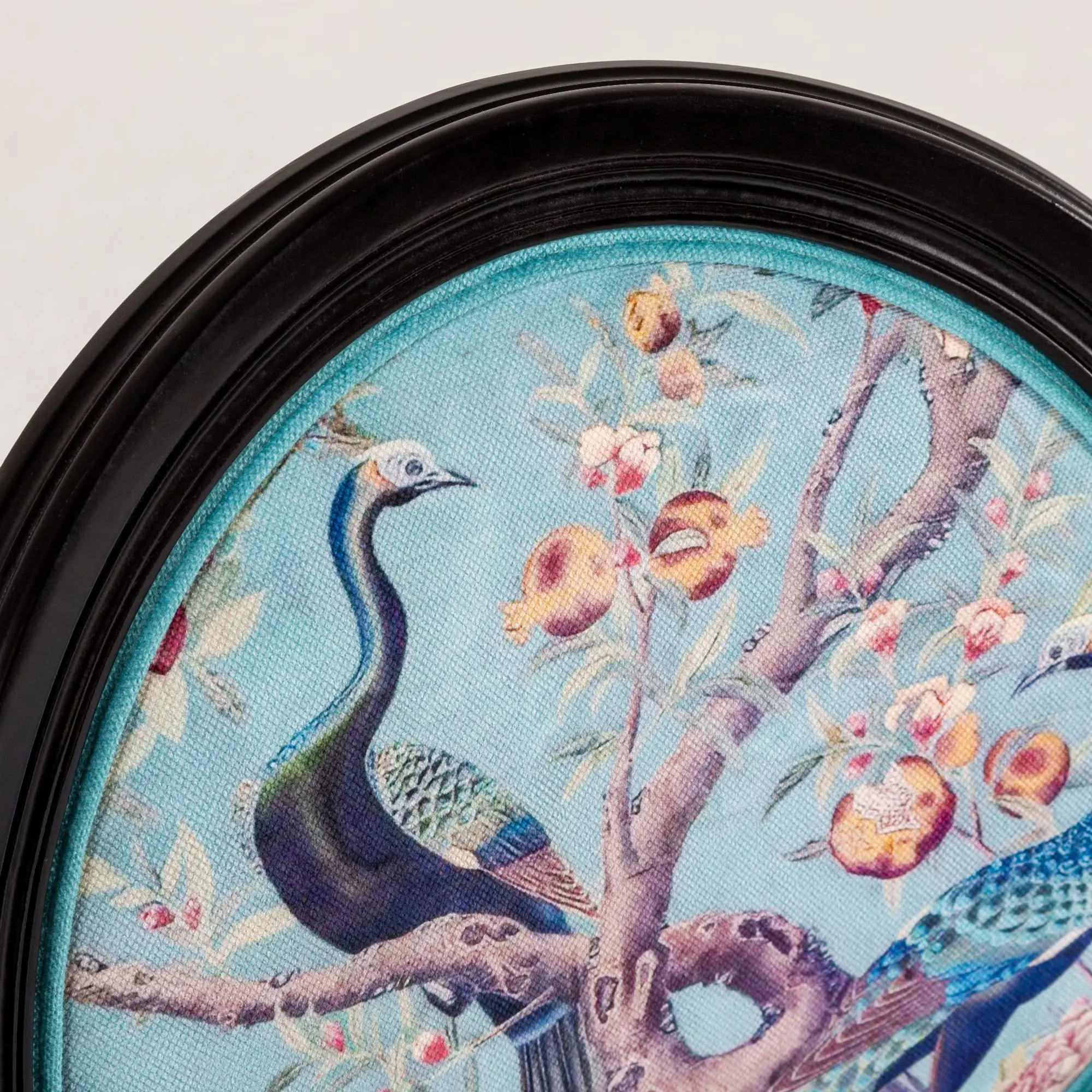Диванетка имеет черный каркас, а на бархатистой обивке бирюзового цвета изображены яркие павлины, красные плоды граната, розовые цветы пиона – эти классические изображения, присущие стилю шинуазри, добавят ноты изысканности и благородства в ваш интерьер, подчеркнет вкус и статус его владельца.