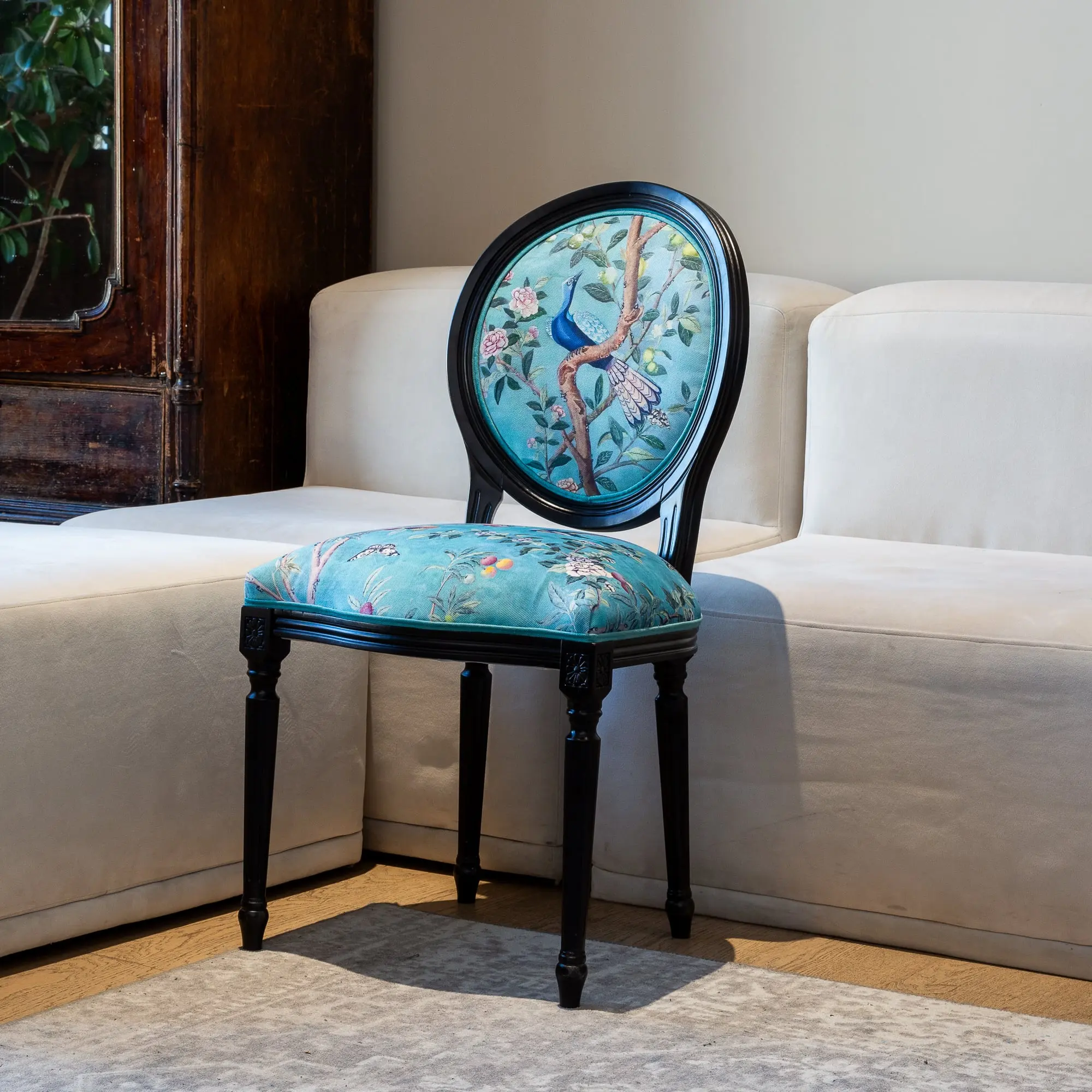 Сочетание черного цвета каркаса стула «Императорский сад» и бирюзовая обивка с изображением ярких павлинов является классическим.