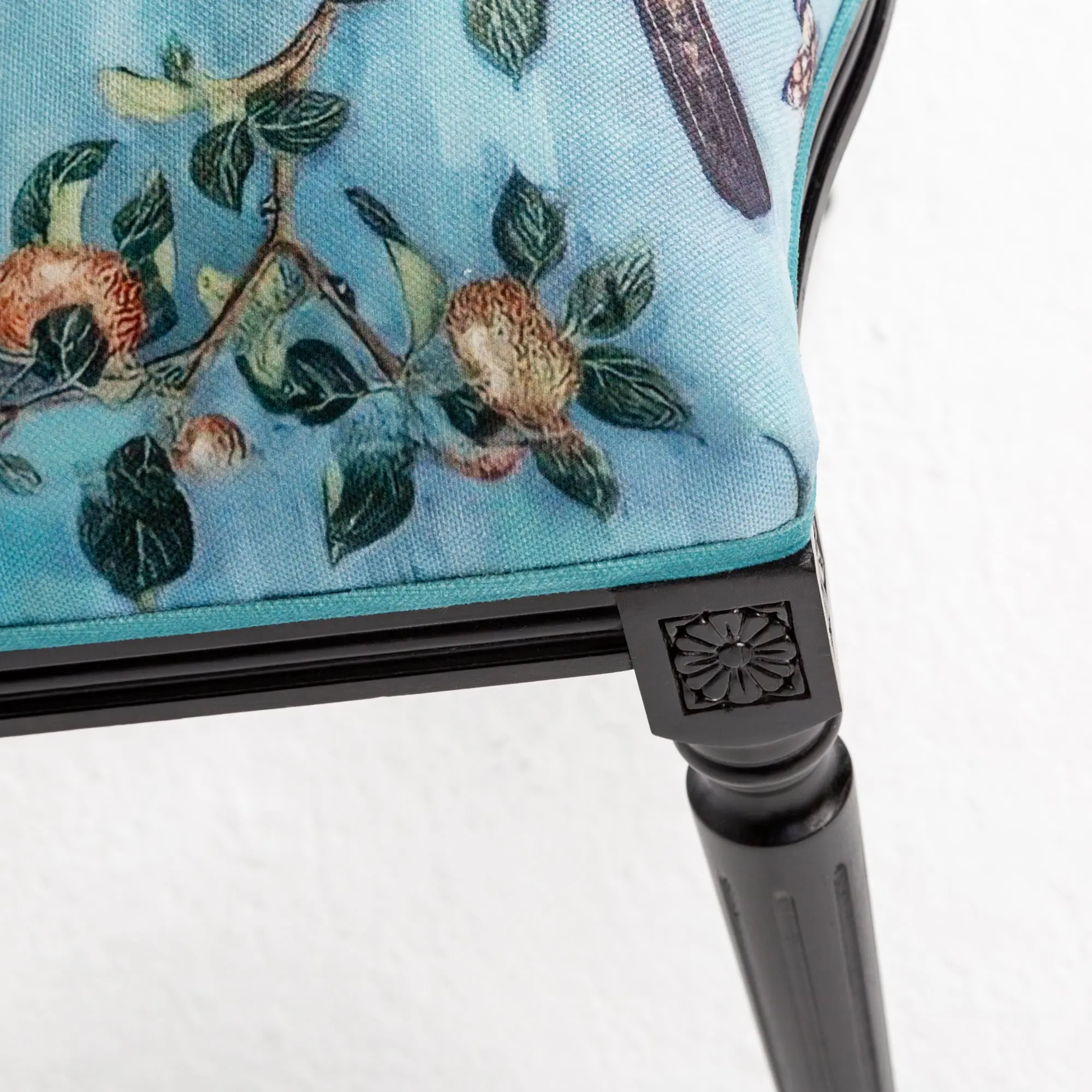 Бирюзовый фон этого экземпляра является ведущим. Это очень привлекательное решение. Красивый, освежающий и бодрящий, он способен «оживить» любое пространство, наполнить его воздухом, добавить простора и легкости. Акцентом являются яркие пятна – синие цветы и павлины, красные плоды граната, розовые пионы. Этот роскошный и экзотический стул в стиле шинуазри отлично впишется в современные интерьеры.