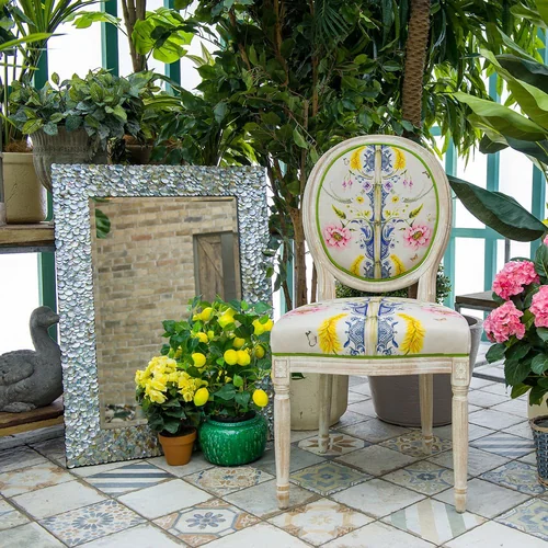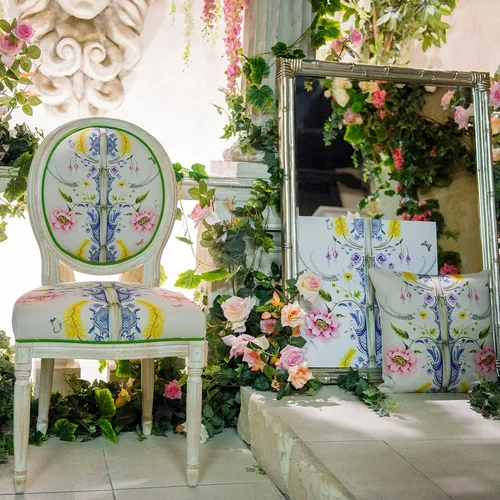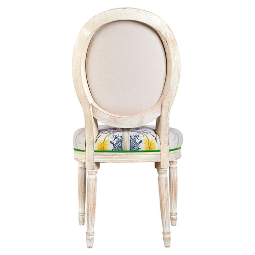 Этот стул - дизайнерский изыск, достойный моментального восторга и страсти к коллекционированию. Пышный цветочный натюрморт на фоне плотной льняной фактуры успешно подражает винтажному гобелену, а благородный дворцовый корпус любуется филигранной цветочной резьбой, вторящей дизайну обивки. Корпус стула изготовлен из бука. Резьба играет ведущую роль: стул украшен изящными желобками, кольцами и розетками, определяющими высшую степень мебельного мастерства. Благородная природная фактура древесины подчеркнута рукописной патиной. Обаяние старины богато специфическим теплом и уютом.