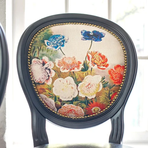 Стулья "Храм флоры" воплотили массу живописных и технологических знаний, накопленных за всю историю интерьерной моды. Обивку стула украсил пышный цветочный букет, сошедший с уникальной английской гравюры XVIII века. В сочетании с плотной льняной фактурой, она ассоциирует благородный древний гобелен. Статный дворцовый корпус блещет изящной цветочной резьбой, гармонично дополняющей рисунок обивки. Гирлянда золотистых анкеров искрится вокруг черного корпуса подобно драгоценностям. Добавьте к этому надежность натурального бука - и получите эталонный интерьер гостиной комнаты и столовой, спальни и кабинета.